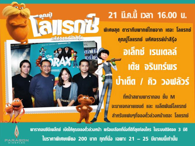 อเล็กซ์ เรนเดลล์ , เต้ย จรินทร์พร , ป๋าเต็ด ยุทธนา , คิว วงฟลัวร์ เตรียมยกทีมมาพบแฟนๆ ในงานเปิดตัวภาพยนตร์แอนนิเมชั่นสุดฮอตที่เปิดตัวสูงสุดตลอดกาล เรื่อง เดอะ โลแรกซ์ คุณปู่โลแรกซ์ มหัศจรรย์ป่าสีรุ้งโดยจะมีการพบปะแจกลายเซนต์และเมล็ดพันธุ์โลแรกซ์ ที่บริเวณชั้น M สยามพารากอน เวลาประมาณ 16.00 น. ก่อนที่จะขึ้นไปร่วมงานใหญ่ ที่ชั้น 5 ในเวลา 18.00 น. นอกจากนี้ ทางยูไอพี ประเทศไทย ยังได้ร่วมกับพารากอน ซีนีเพล็กซ์ และ กลุ่มบิ๊กทรี ร่วมกันจัดบูธแสดงการอนุรักษ์ต้นไม้และพลังงาน ในบริเวณชั้น 5 อินฟินิซีตี้ ฮอลล์ ซึ่งจะมีเซเลบริตี้ และดาราหัวใจอนุรักษ์ อาทิ เช่น ดร.ศศิน เฉลิมลาภ (มูลนิธิสืบ นาคะเสถียร),ดร.สรณรัชฏ์ กาญจนะวณิชย์ (กลุ่มบิ๊กทรี/มูลนิธิโลกสีเขียว), คุณนุ่น ศิรพันธ์, คุณท็อป พิพัฒน์, คุณตัน ภาสกรนที และอีกมากมาย ที่จะให้เกียรติมาร่วมงานเปิดตัวในครั้งนี้ด้วย