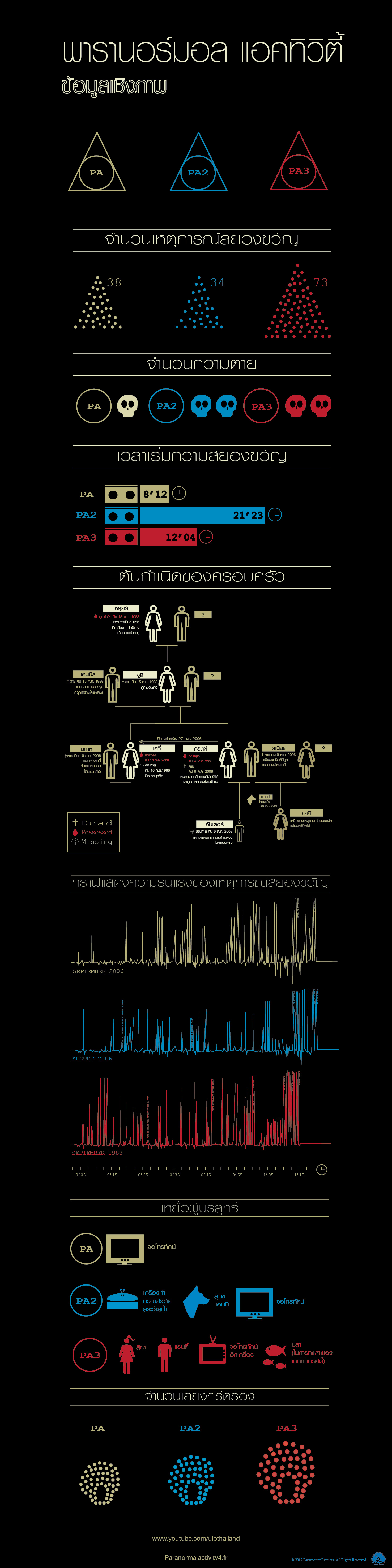ภาพยนตร์แนวสยองขวัญที่ทั่วโลกรู้จักกันดีกับสไตล์เรียลลิตี้ พารานอร์มอล แอคทิวิตี้ 4 เฮี้ยนแรงเหนือความคาดหมาย เปิดตัวเป็นอันดับหนึ่งในอเมริกา โกยไปประมาณ 30 ล้านเหรียญ เปิดกระแสฮาโลวีนให้หลอนสุดๆ และมีการเปิดเผยสถิติซึ่งจัดทำเป็นภาพกราฟฟิค จะเผยให้เห็นว่า ความหลอนความเฮี้ยนของพารานอร์มอลในทุกภาคตั้งแต่ 1-3 นั้น มีจำนวนมากขึ้นเรื่อยๆ ซึ่งแน่นอนว่าในภาคที่ 4 นี้ เหตุการณ์สยองขวัญนั้นก็มีเพิ่มมากขึ้น หลอนขึ้น เพื่อสนองความต้องการของแฟนๆ ที่ติดตามชมมาโดยตลอด และเรื่องราวของครอบครัวนี้ยังคงไม่จบในภาคนี้ ปมปริศนายังคงมีต่อเนื่องให้แฟนๆทุกคนได้คาดเดาและติดตาม กันต่อไปอย่างแน่นอน คลิกไปชมคลิปความสยองของพารานอร์มอล แอคทิวิตี้ 4 ทั้งหมดได้ที่ www.youtube.com/uipthailand หรือ http://www.youtube.com/playlist?list=PLTwQpcrpV680IEBdaGk0z35uuCYM_eTdt&feature=plcp