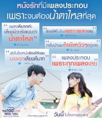 กระแสความซึ้งแรงจนทำให้ The 100th love with you ย้อนรัก 100 ครั้ง ก็ยังเป็นเธอ ติดเทรนด์ทวิตเตอร์ ประเทศไทย ตั้งแต่วันแรกที่ฉายรอบสื่อมวลชน ล่าสุด หนังยังคงแรไม่หยุด เมื่อแฟนคลับ และ เพจดัง ต่างรุมให้คะแนนความโรแมนติก และ ความหล่อน่ารัก ตะมุ ตะมิ ของ พระเอก รวมถึงพล็อต ที่ทำให้ผู้ชมเกิน 80 เปอร์เซ็นต์ ที่ได้ดูต้องเสียน้ำตาให้กับหนัง ล่าสุดหลังเข้าฉายในโปรแกรมปกติ ทางโรงภาพยนตร์เตรียมเพิ่มรอบฉายให้แฟน ๆ ได้ไปฟินกันในวันถัดไปแล้ว